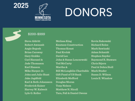 Minnesota Trout Unlimited would like to express our appreciation to each of the record 288 generous donors who donated during our last fiscal year, which ran from April 1, 2024, to March 31, 2025. Your collective contributions totaled an impressive $130,000 for the mission! Regardless of the amount, your gifts enable Minnesota TU’s habitat improvement, policy advocacy, and education