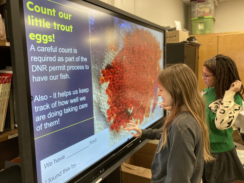 During sorting, we aim to place approximately 300 eggs in each tank. We have learned that 300 rainbow trout eggs weigh about 18.5 grams, which enables efficient sorting based on the program’s tank capacity. While this weight-based method is useful, it is not an exact science. Teachers and students therefore conduct a careful manual count using photographs or projections of the eggs, grouping them to verify the exact number each class will raise. This step serves dual purposes: it’s engaging for students and essential for obtaining accurate data for the required DNR reports at the end of the school year. Once the eggs hatch, counting becomes significantly more difficult and less reliable.