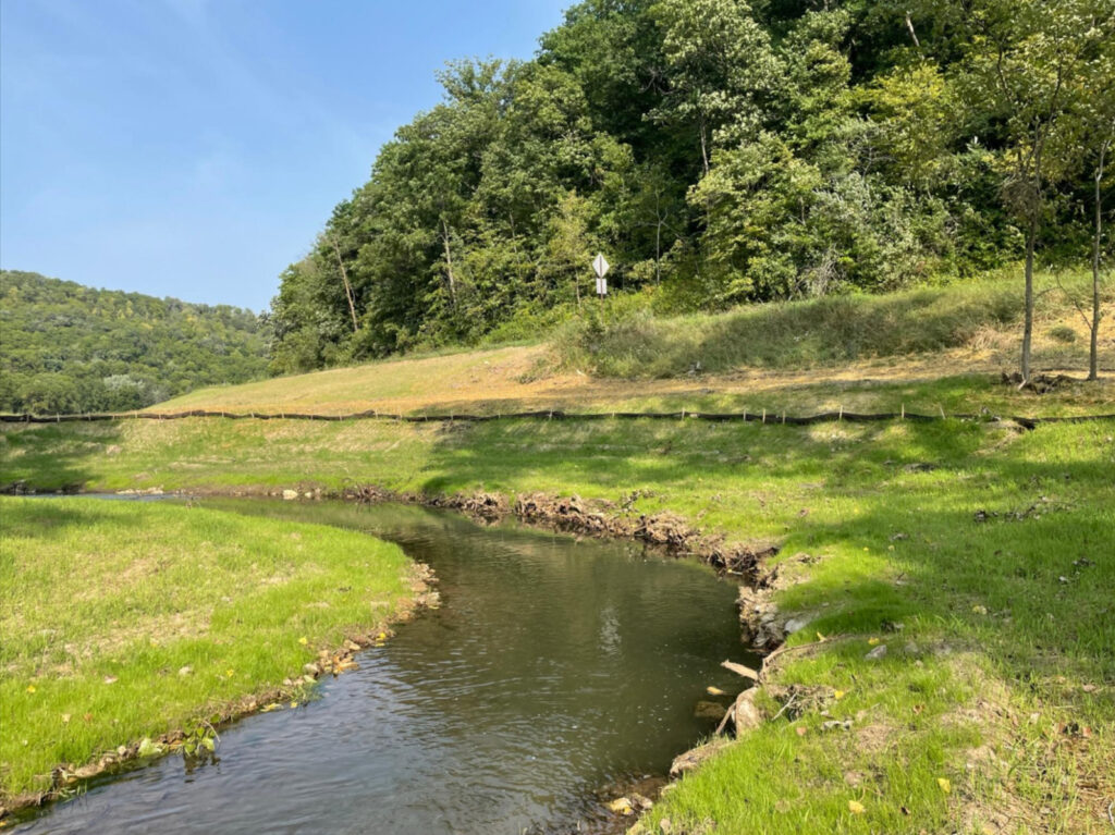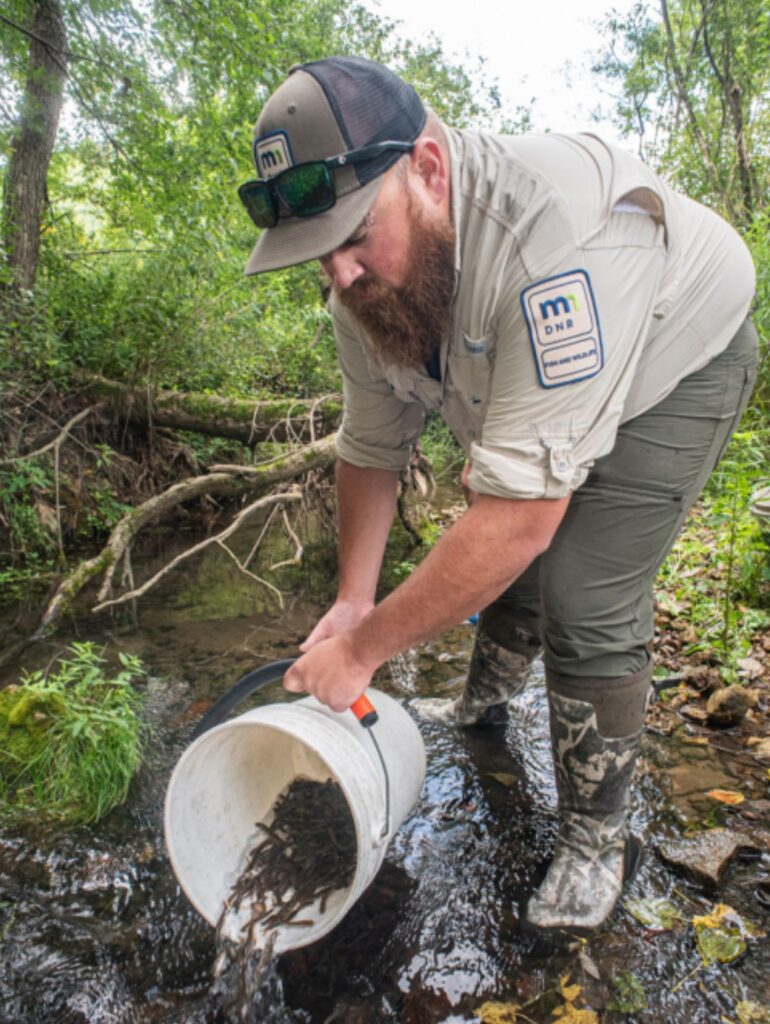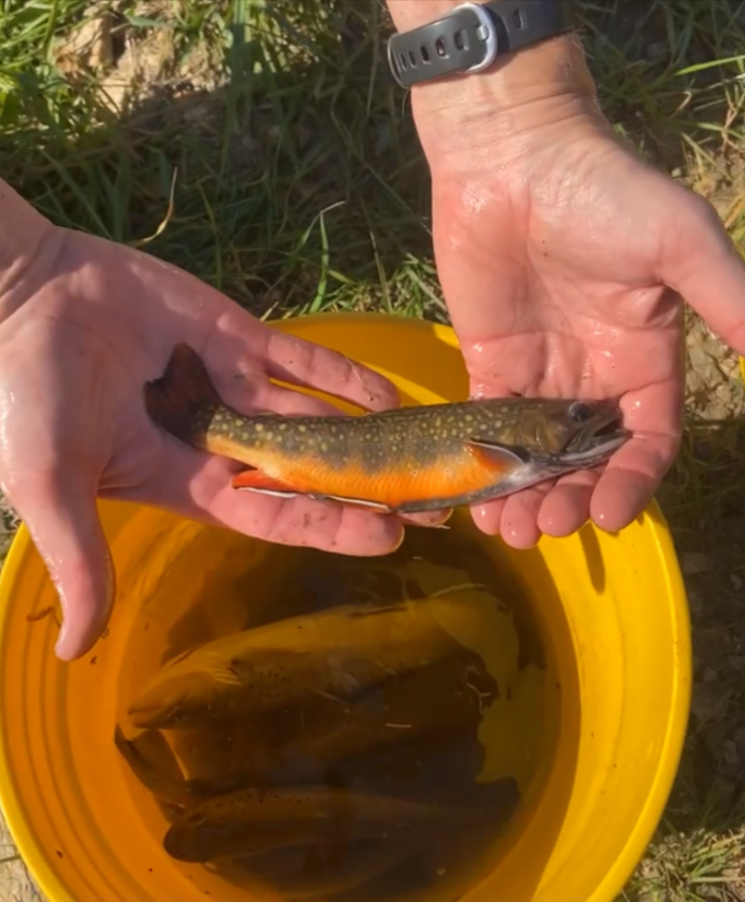 Lanesboro DNR staff stock heritage strain brook trout in Cedar Valley Creek upstream of project in August 2023 (photo: John Weiss)