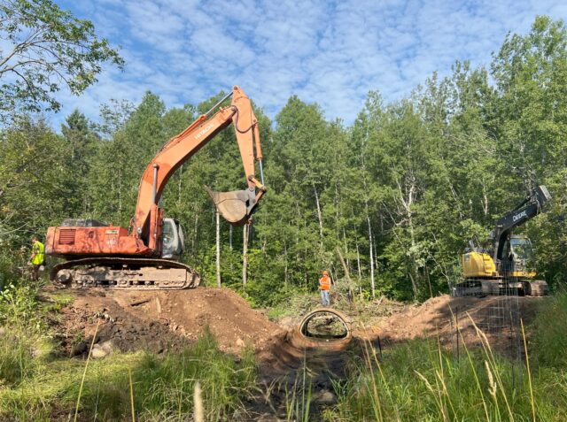 MNTU partnered with the City of Hermantown to replace an undersized barrier culvert on Keene Creek at Okerstrom Road with a properly sized pre-cast concrete arch culvert with headwall and wingwalls, reconnecting wild brook trout with 8,300-ft of habitat. This new passage connects two previous MNTU in-stream projects above and below the crossing, and the installation included a new cross vein to maintain depth of the pool below the culvert, added toewood and boulders within the pool, riffle substrate throughout the culvert, and the planting of dozens of native trees, including white pine, white spruce, and white cedar along the stream edge.